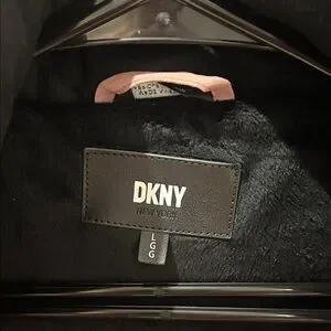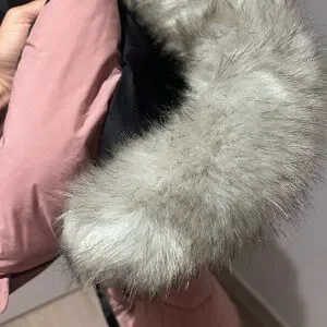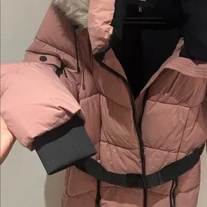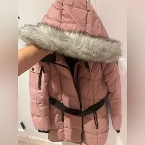 Stylish DKNY puffer coat in pink. Features a fur-trimmed hood and a sleek black belt. The coat does have some SMALL, not very noticeable stains (please see pics)