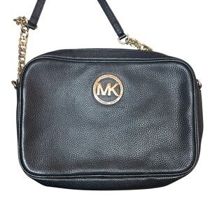 Chic black crossbody bag by Michael Kors. Features a stylish gold logo and chain accents. Perfect for everyday use. Good condition with a few marks as shown.