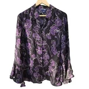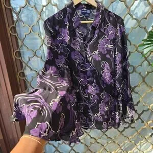 Venezia Jeans Womens Purple Floral Silk Blouse 14/16 Bell Sleeve Whimsigoth Boho Y2K Fairy Grunge Semi-sheer