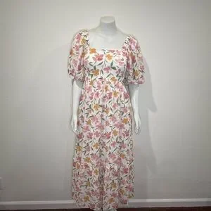 Embrace elegance with this floral maxi dress, featuring a beautiful blend of pink, orange, and green hues. Perfect for any occasion. New from high end boutique. Soft light feel.