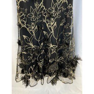 The embodiment of grace, this floor-length gown in black features an off-the-shoulder neckline, gold and glitter tulle, and a black velvet belt detail. The 3D flowers on the skirt give you an unforgettable look. Back center zipper closure. Fully lined.
