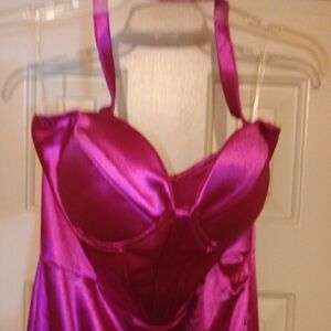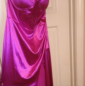 Women's fuchsia 95% polyester 5% elastane long dress. Tall girl friendly. Size large. Have not been worn. Just tried on. NWOT. Can be worn as a prom dress wedding dress or an evening dress. Perfect for special occasions. Just have lite snags on it. Nothing major. From a smoke free pet free home.