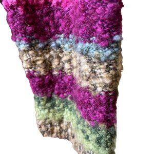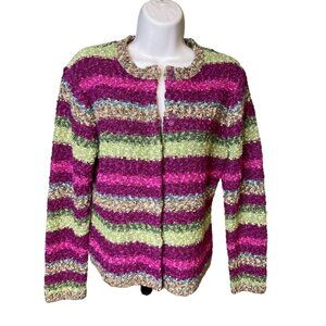 This Vintage Talbots Wool Blend Sweater for women is a size M knit cardigan. Its striped pattern in purple, green, and blue hues is accented by double snap buttons.