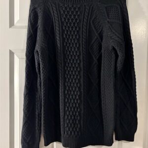 Stay warm and stylish with this classic black cable knit sweater. Perfect for any occasion.