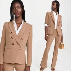 Veronica Beard Miller Dickey Jacket in Acorn Brown. Women's Size 2 / XS. Features mid weight stretch suiting, peaked lapels and double breasted button closure, long sleeves, padded shoulders, button cuffs, welt breast and flap front pocket, single back vent. 86% polyamide, 14% elastane. Small blue mark on interior neckline over brand tag. Retail $748.