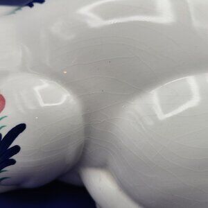 Sweet white ceramic cat by ELPA Alcobaca in Portugal. This crouching kitty, ready to POUNCE, features a lovely floral design with light blue glass eyes and a sweet little (removable) neck bow.