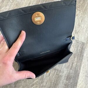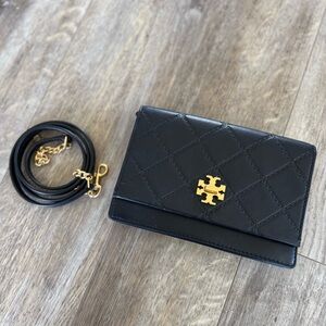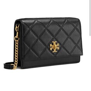 Experience timeless elegance with the Tory Burch Black and Gold Quilted Crossbody Bag. This sophisticated accessory features a classic diamond quilted pattern and a luxurious gold chain strap, perfect for day or evening wear. Its compact design offers the versatility of a wallet with the style of a chic handbag.