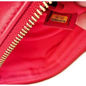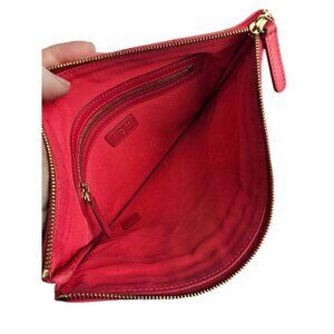 This clutch is in good pre-owned condition with normal light wear and character marks. The lambskin shows some light use, including a visible scratch on the lower front (see photos), as well as some minor discolorations and marks. Hardware may show light scuffs and tarnishing. The interior is clean with only normal light use, no scents. Zipper runs smoothly. Structurally sound with beautifully soft leather.