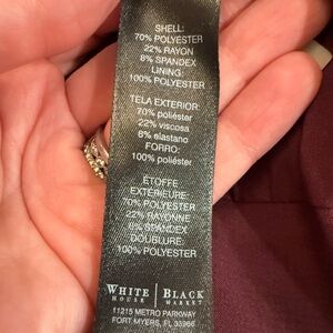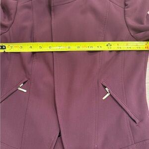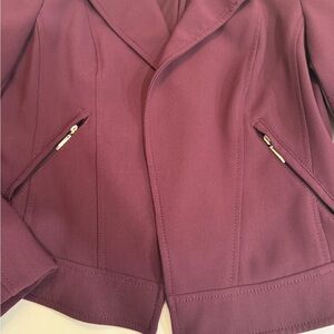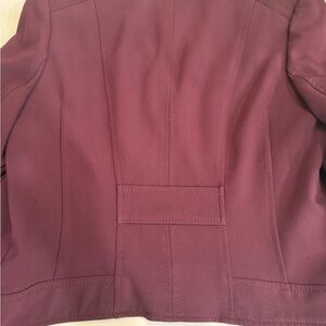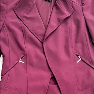 Vguc, this set is machine washable. No flaws, gently preloved! The first picture is AI generated to give you an idea of what it looks like on but is not exact. Please view all photos and ask any questions prior to purchase. I would describe the color as deep maroon, or merlot, it’s a beautiful rich color perfect for fall and winter. The jacket is open, it’s a moto style with diagonal pockets with zipper close, the jacket and skirt are beautifully structured. You can tell it’s very high quality and make it super flattering. This is a stunning suit set. Perfect for interviews and the office!