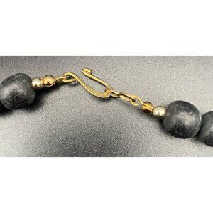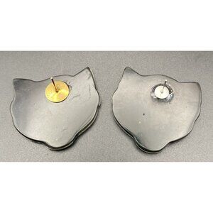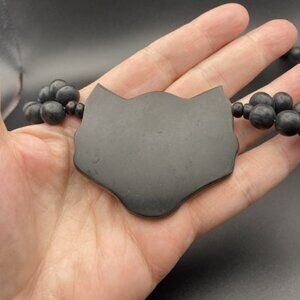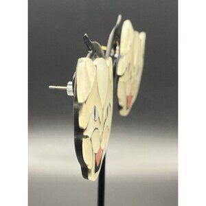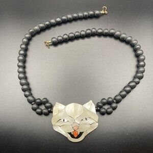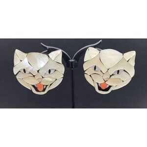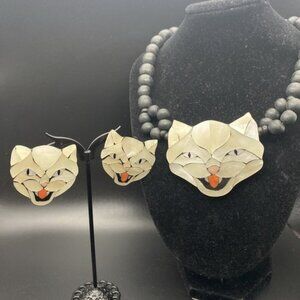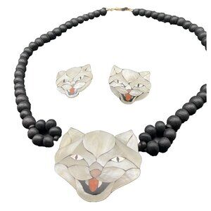 Vintage Lee Sands Necklace Earrings Mother of Pearl White Cat Face Black Wood Beads