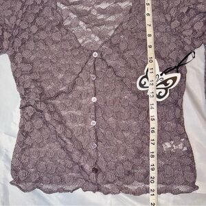 Sweet & Lacey lavender see-through top. Will need to wear a tank top under it. It says it’s an XL but according to measurements it’s smaller. Measurements in photos.