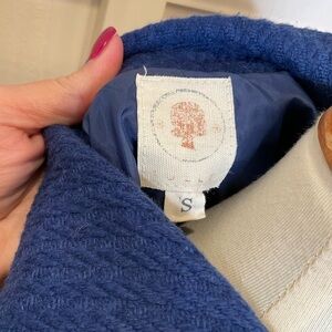 Tulle brand blue pea coat. One large button at top with snap closure all the way down.