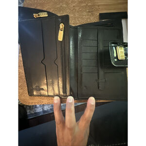 It is double sided. The front side with the Balenciaga logo opens up to a larger area where you can store a number of credit cards possibly even a passport includes two zippered pockets in this area also. The opposite side has a fold over snap closure where you can store your bills and change.