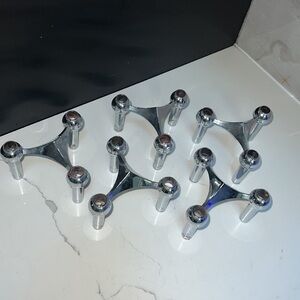 These modular candle holders were created by Fritz Nagel and Caesar Stoffi. Comprised of individual, stackable chrome elements, these versatile and unique Nagel S22 candle holders creation makes quite the statement. The arrangement possibilities are truly endless with the many interlocking pieces. Minor wax residue inside the holes. Measurements: 4” W x 2.63” H. Made in Germany.