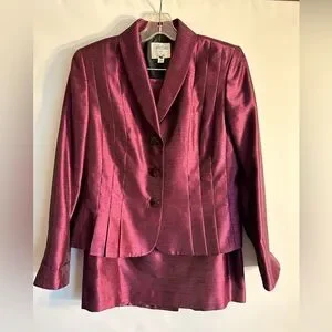 Elegant burgundy skirt set with tailored jacket. Features button details. Perfect for formal occasions.