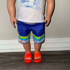 Doll wearing a white tank top with a surfing graphic, blue shorts, and red sandals. Features curly blonde hair.