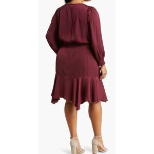 A handkerchief hem creates movement on a long-sleeve dress framed by a split neckline and shapely smocking.