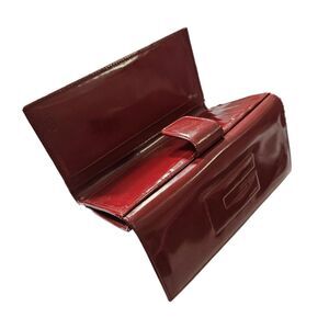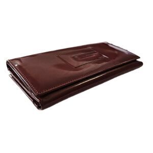 This gorgeous vintage Gucci long wallet features a tri-fold continental design, burgundy (dark red) patent leather, silver-tone hardware, and a large embossed G logo on the front. The exterior has a pocket with snap closure and the interior offers additional storage. From the Y2K era and made in Italy, this long wallet exhibits exceptional craftsmanship Gucci is known for.