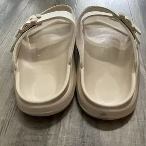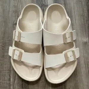 Stylish white double strap sandals with adjustable buckles. Perfect for casual wear.