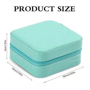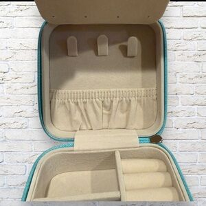 Elegant teal jewelry box with a mirror. Features multiple compartments for organization.