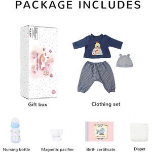 * What You Get: Lovely lifelike reborn doll x1, Clothes set as pictured x1, Feeding bottle x1, Magnetic pacifier x1, Birth certificate card x1, diaperx1, Gift box x1.