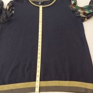 Elevate your style with this chic black sweater featuring unique gold thread and patterned sleeves. Perfect for holiday dressing or any occasion. measurements taken flat: 20" pit to pit. 27" sleeve length. 25" back length from neck.