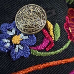 BLACK LIGHTWEIGHT DENIM jacket featuring vibrant floral embroidery on front , collar and cuffs. Unique craft buttons on cuffs ( see pics) Perfect for adding a pop of color to any outfit. 2 full size front pockets. Tags are missing …