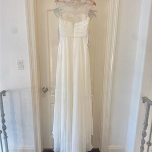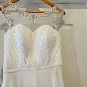 This elegant gown offers a timeless look with its classic silhouette. It would be perfect for a beach wedding!