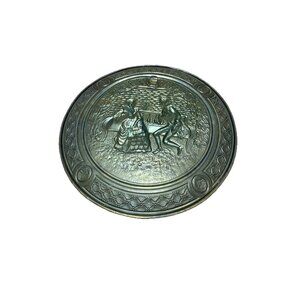 The product is a vintage decorative wall plate made of repoussé brass, featuring an romantic courting scene. It is crafted in England, showcasing exquisite attention to detail and quality craftsmanship. The brass exterior color adds a touch of elegance and sophistication to any room, making it a unique and charming addition to your home decor. This piece of wall décor captures the essence of love and courtship in a beautifully detailed design.
