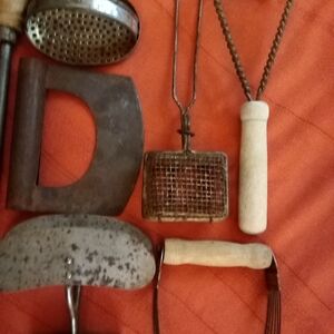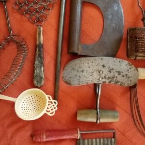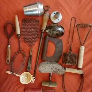 A collection of vintage kitchen utensils in various metal and wood finishes.