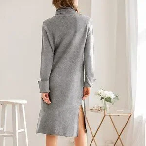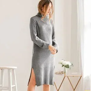 Lulus Exclusive! Be the trendiest babe in the room with the Lulus Snuggled Up Light Grey Knit Turtleneck Midi Sweater Dress! Super soft lightweight knit shapes this cozy sweater dress with a turtleneck, cuffed long sleeves, and a relaxed bodice that ends at a modest midi hem with twin side slits. Pair this cozy number with chic ankle booties for a fall fashion approved look!