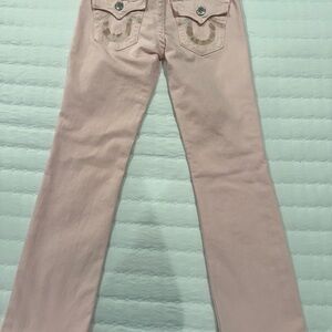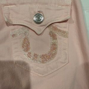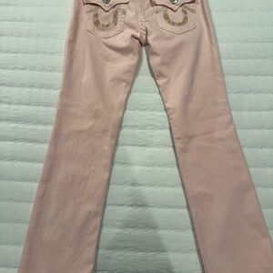 These Women’s True Religion Pink Bootcut Blingy Jeans in size 26 are a stylish and trendy addition to any wardrobe. Made from a comfortable cotton blend material, these jeans feature a 90’s style low rise and a flattering bootcut fit. The pink color and embellishments of glitter, buttons, beads, zippers, sequins, and logos add a touch of glam to the design. With a 5-pocket design and a 25.5-inch inseam, these jeans are perfect for adding a pop of color and style to any outfit.