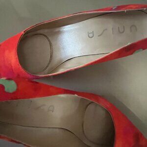 Unisa – Vibrant multi-color fabric pumps with pointed toe and slim heel. A fun pop of color for any outfit!