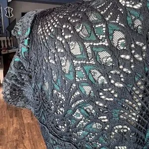 The top features an exquisite black guipure lace overlay in a beautiful geometric/fan pattern. It is fully lined in a rich, contrasting color dark green—that makes the intricate black lace truly pop! Design details include a chic mock neck/high neck with a delicate ruffled edge, elegant flutter sleeves, and a fitted silhouette. It secures with a hidden zipper down the center back for a smooth, seamless fit