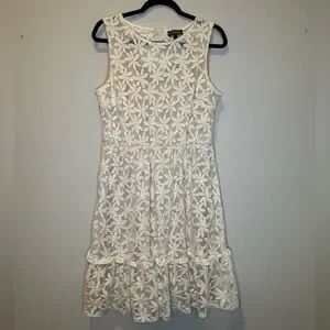 Beautiful Luxology sheer cream dress with embroidered flowers and tan slip underneath, size 12