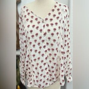 Loft Floral Pattern V-Neck Button Down Blouse Crochet Accents Boho Size Large