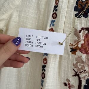 Elegant cream blouse with floral embroidery. Features three-quarter sleeves. Perfect for casual outings.