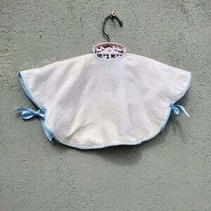Adorable handmade vintage baby capelet in soft white flannel, finished with sky-blue satin ribbon ties, rickrack trim, and delicate hand embroidery. Pristine and no signs of use!