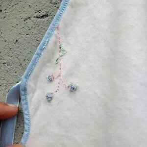 ~ Hand-embroidered floral sprigs in pastel pink, blue, and green