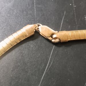 this is an Italian made 18k bonded to solid sterling silver choker with an extention about 2 inches long. this is in great used condition and will never fade it will always look like 18k gold.