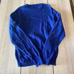 blue, red, and green pullover sweater. “The links at SPANISH BAY” embroidered onto the sleeve.