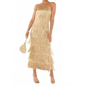 Elevate your cocktail party attire with the Gatsby Maxi Dress by Show Me Your Mumu, a striking piece in Gold Rush Fringe designed to inspire movement. This sheath silhouette features a sleeveless, halter neckline that beautifully complements its textured finish. Perfect for fall occasions, this dress embodies the quiet luxury trend without compromising on an elegant fit for all body types.
