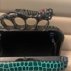 This stylish green clutch features a unique handle skeleton with red eyes design, perfect for adding a touch of elegance to any outfit. Ideal for evening events or a night out. Does come with strap that can be attached. Thanks for looking and have a great day!!