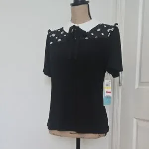 CeCe Black Blouse with White Floral Details