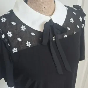 Stylish black blouse with charming white floral details. Perfect for versatile wear.