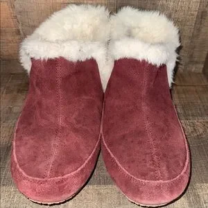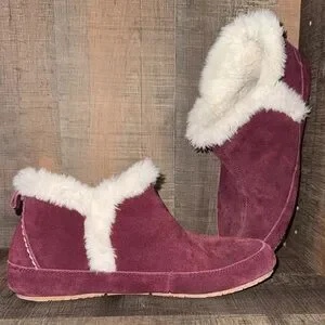 Lands' End Women's Burgundy Suede Slippers with Faux Fur-size 8
