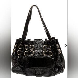 Sophisticated black shoulder bag with a glossy finish. Features elegant hardware accents. Perfect for stylish outings.