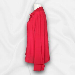 This long sleeve Karen Scott blouse is a beautiful Christmas red is made from 100% polyester. The blouse has pleating in the front and has buttons all the way down the front and at the cuffs. This blouse is perfect to pair with a pair of slacks and a blazer or to wear to special events during the holidays. Machine wash for easy care. Please see pictures for PTP and length measurements.