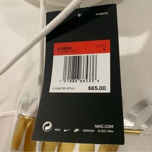 Chic and cozy Nike hoodie. Features a white base with a metallic gold swoosh. Perfect for casual wear.