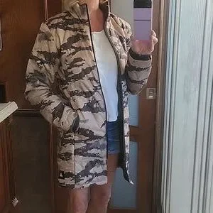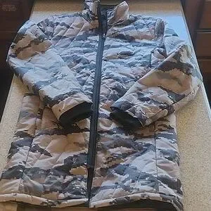 Adidas Long Quited Coat Marapat Digital Desert Camo, Size S- see pics for measurements, Full Zip, Khaki & Forest Green, Ribbed Cuffs, Soft Material Along Neckline, Front Hip Zippered Pockets, Stitched Quilted, Medium Weight, Excellent (Like New) Pre-Loved Condition, Dog Friendly Home.